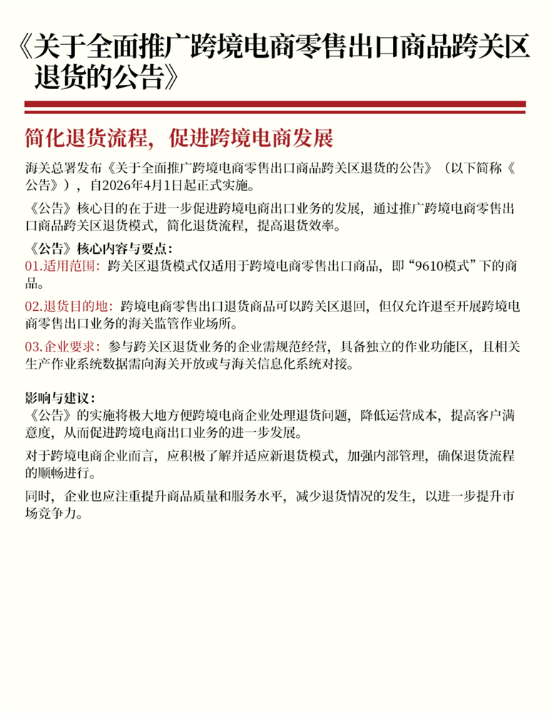 ○《关于全面推广跨境电商零售出口商品跨关区退货的公告》