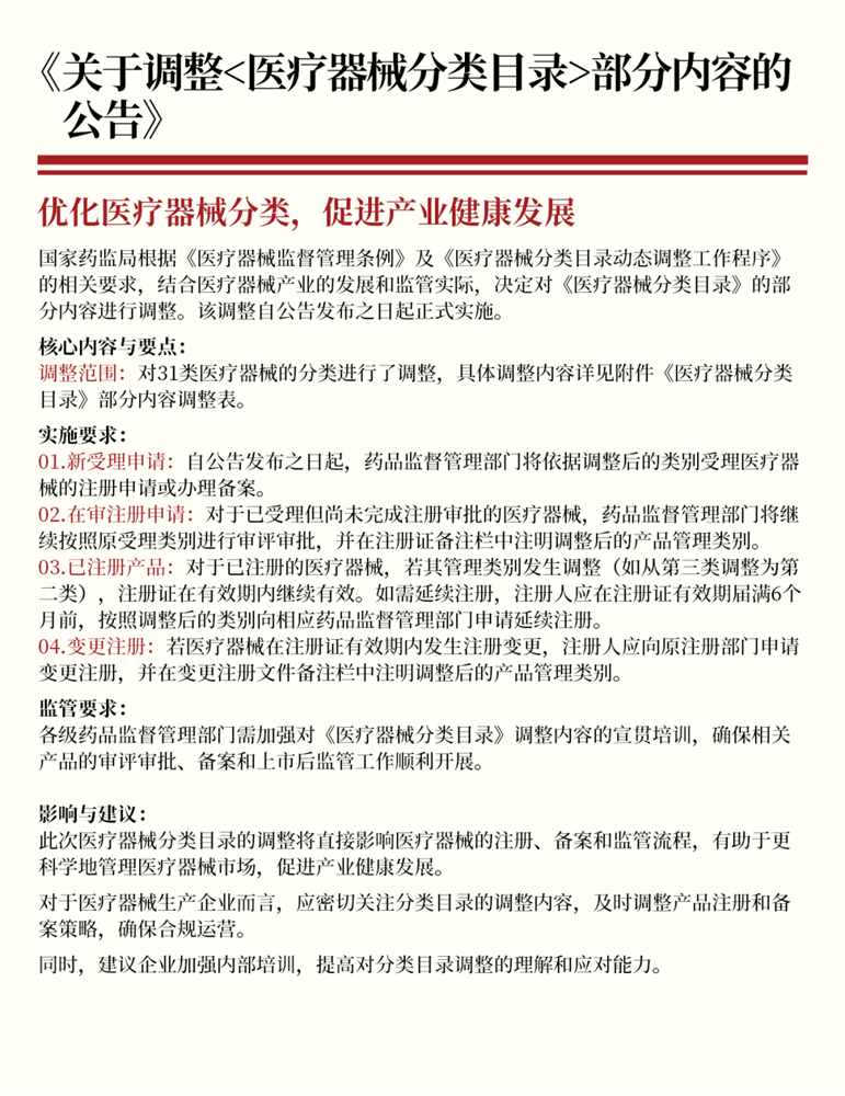 ○《关于调整<医疗器械分类目录>部分内容的公告》